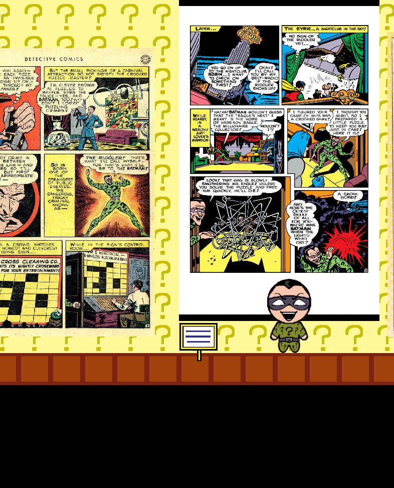 Throw the Riddler out of a window! Maybe learn about some of his designs over the years. Have fun!!!